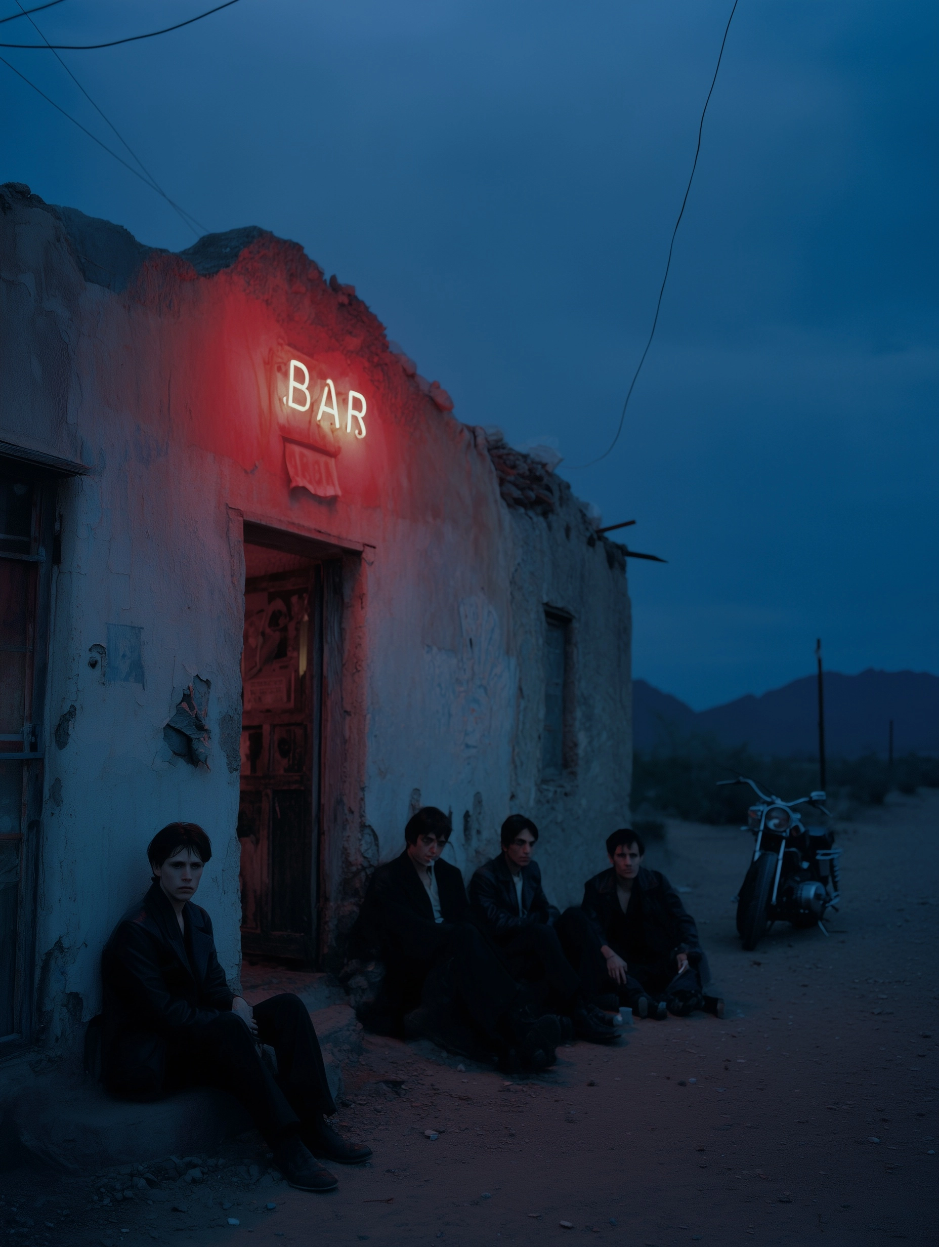 group of teenagers smoking outside a small town bar at night, sardinian village atmosphere, cheap ne