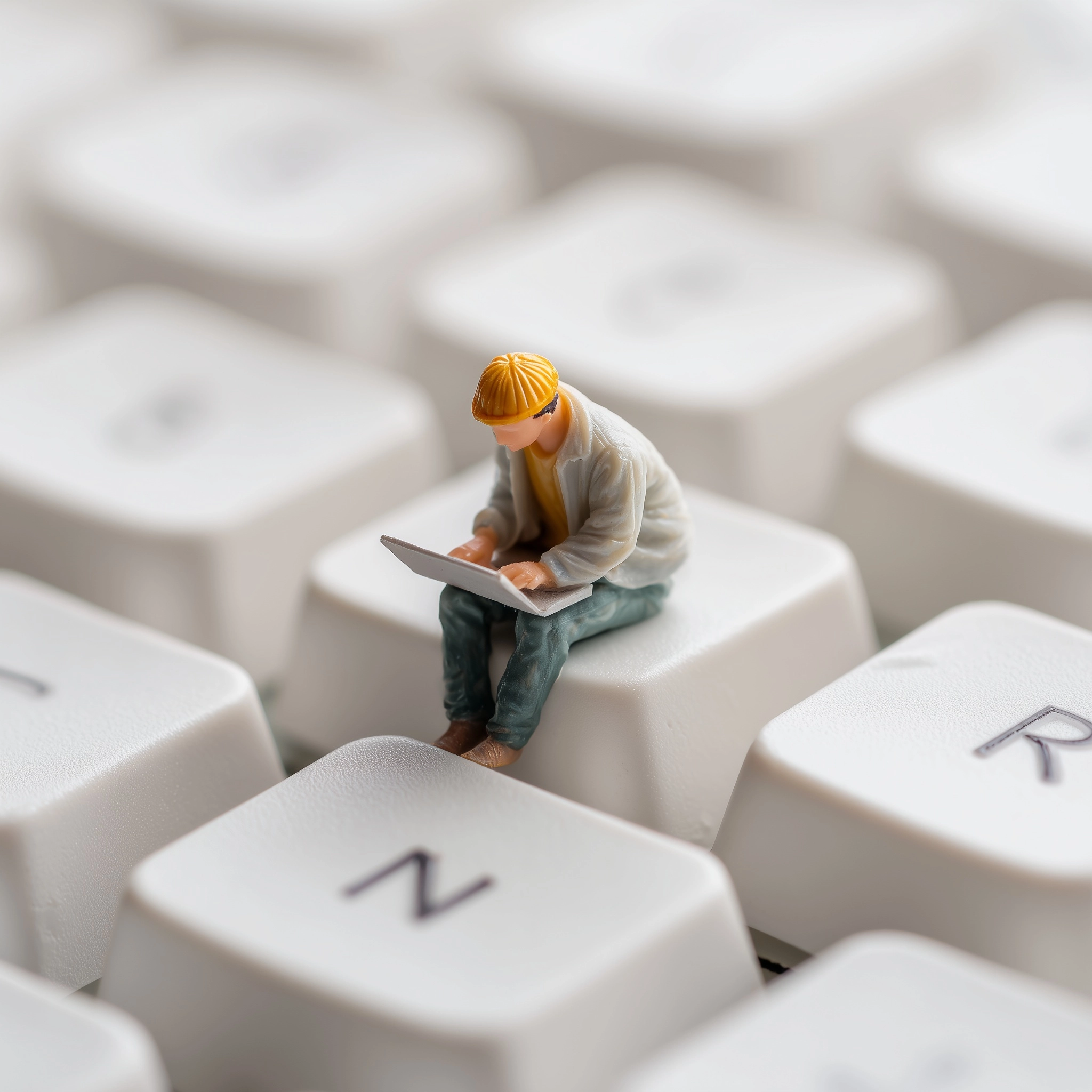 Macro close-up photorealistic image of a tiny person wearing casual clothes, sitting on a single whi